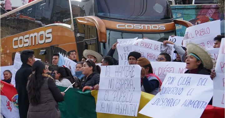 En plena vacación invernal crece la demanda de viajes, pero no hay buses debido a la falta de combustible. Hay boleteros que se quedan sin trabajo. Choferes y sus familias protestan en la puerta de la Terminal de Buses de La Paz.