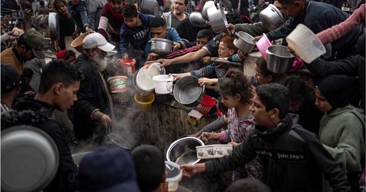 ¿Esto es comestible? Lo recogió del suelo para alimentar a sus hijos. ¡Tengan piedad de nosotros! ¡Tengan piedad de nuestros niños! Mírennos con compasión, dijo una mujer palestina tras ver a otra recoger restos de comida del suelo después de que se agotaran los suministros del comedor comunitario en un campamento de desplazados improvisado en Gaza.