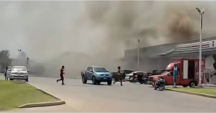 Humo sale de varios negocios en Tailandia tras ser alcanzados por un cohete lanzado desde