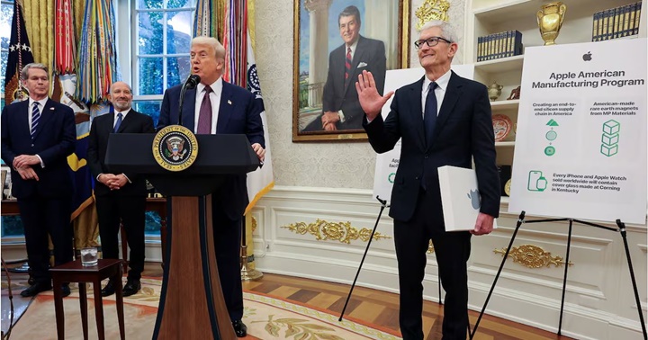 El republicano se jacta de que ya están llegando a EE UU “miles de millones” con la entrada en vigor de las nuevas tasas. Donald Trump con el consejero delegado de Apple, Tim Cook, a la derecha, ayer en el Despacho Oval en la Casa Blanca.