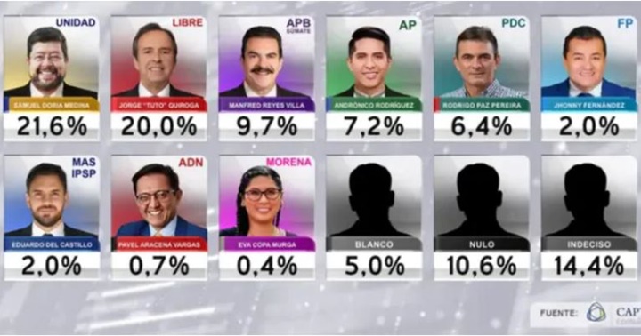 Según las encuestas, las últimas autorizadas antes de los comicios, el empresario de centroderecha Samuel Doria Medina, que postula por la Alianza Unidad, está a la cabeza de los sondeos de Ipsos-Ciesmori y Captura Consulting, con un 21,2% y 21,6%, respectivamente.
