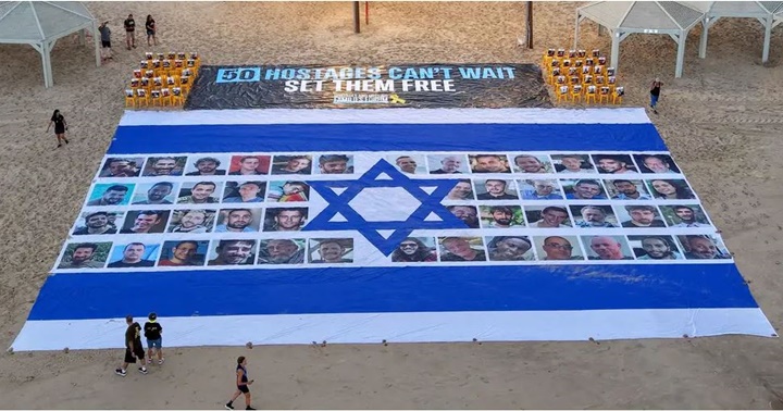 Benjamín Netanyahu ha anunciado la recuperación de los cuerpos de dos rehenes secuestrados en los ataques del 7 de octubre de 2023. Gran cartel extendido sobre la arena de una playa con los rostros de personas.
