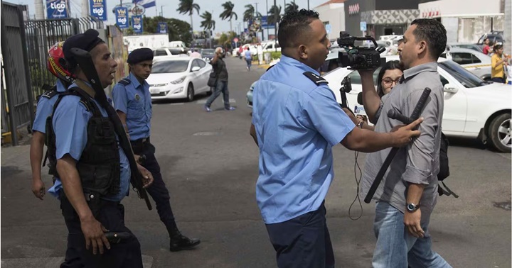 El aparato sandinista recurre a policías, paramilitares y comités de barrio para sofocar disidencias. Un sondeo revela el alcance del clima de control social. La policía nacional empuja a un camarógrafo durante una protesta en Managua, en 2019.
