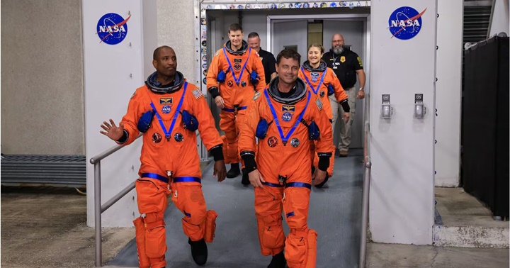 Estados Unidos anuncia un nuevo calendario para la misión que pondrá las bases para el primer aterrizaje humano desde 1972. Desde la izquierda los astronautas, Víctor Glover, Reid Wiseman, Jeremy Hansen y Christina Koch salen del Edificio de Operaciones y Salidas Neil A. Armstrong en el Centro Espacial Kennedy de la NASA (Florida), el 11 de agosto de 2025.