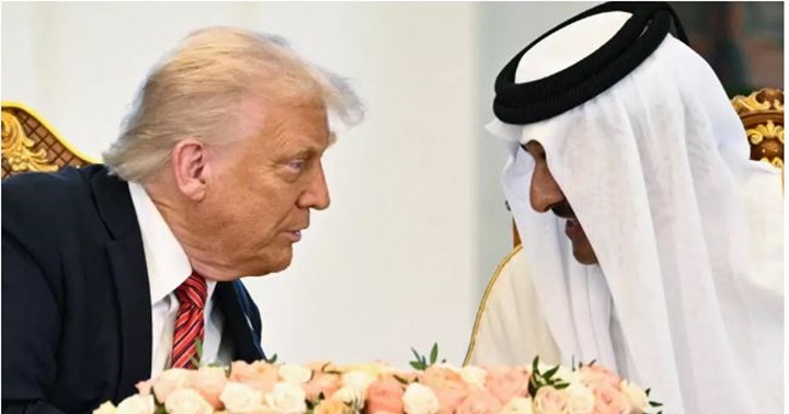 El presidente de Estados Unidos, Donald Trump y El emir de Qatar, el jeque Tamim bin Hamad al-Thani hablan entre sí en el Palacio Real de Doha mayo de 2025.