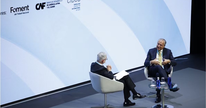 El General Óscar Naranjo, exvicepresidente de Colombia (a la derecha), y el exdirector de El País, Javier Moreno, este lunes 20-10-2025 en Barcelona, durante el WIP.