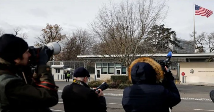 Varios fotógrafos y cámaras de televisión esperan frente a la representación estadounidense en la ciudad suiza de Ginebra para fotografiar a Marco Rubio y la delegación que le acompaña en las reuniones sobre Ucrania.