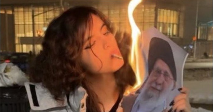 Un manifestante enciende un cigarrillo con el fuego de una imagen en llamas del líder supremo de Irán.