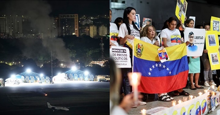 Explosiones y aviones volando a baja altura en Caracas, Venezuela, el sábado 3 de enero de 2026. La captura del presidente Maduro inicia en el país petrolero una incierta transición tutelada por Trump. Familiares en una vigilia por la liberación de presos político en Caracas, enero 2026.