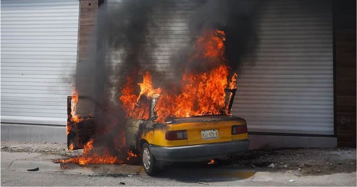 Autos quemados en algunos accesos del municipio de San Juan de los Lagos, Jalisco luego de la detención y fallecimiento del narcotraficante Nemesio Oseguera Cervantes “El Mencho” durante esta mañana en Tapalpa (22/02/26).