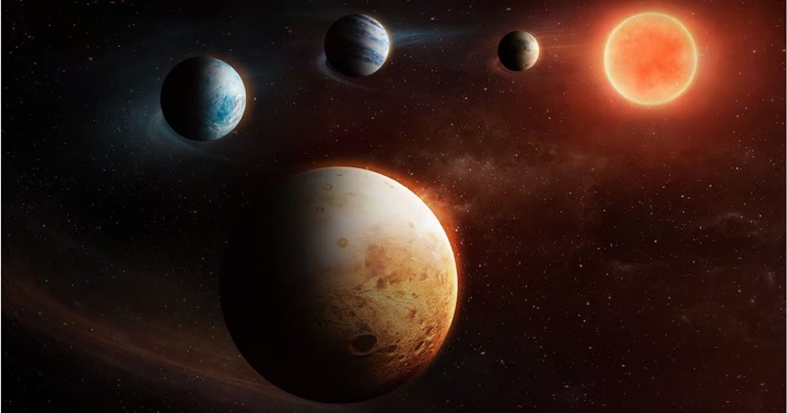 Esta estrella enana roja, el tipo de astro más abundante en el universo conocido, aunque no visible a simple vista en el cielo nocturno, alberga un primer planeta rocoso como la Tierra. Luego hay dos planetas de tamaño intermedio que poseen envolturas gaseosas significativas, parecidos al planeta Neptuno, aunque algo más pequeños. Hasta ahí todo normal. Lo novedoso —lo único— es que más allá del tercer planeta gaseoso hay un cuarto mundo que vuelve a ser rocoso y similar a la Tierra.