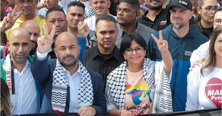 La presidenta encargada baja su tono al máximo contra el presidente estadounidense, quien aseguró, anteriormente, que mantiene una buena relación con el relevo en Miraflores de Nicolás Maduro. Delcy Rodríguez en una marcha de apoyo a Palestina en Venezuela.
